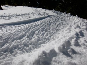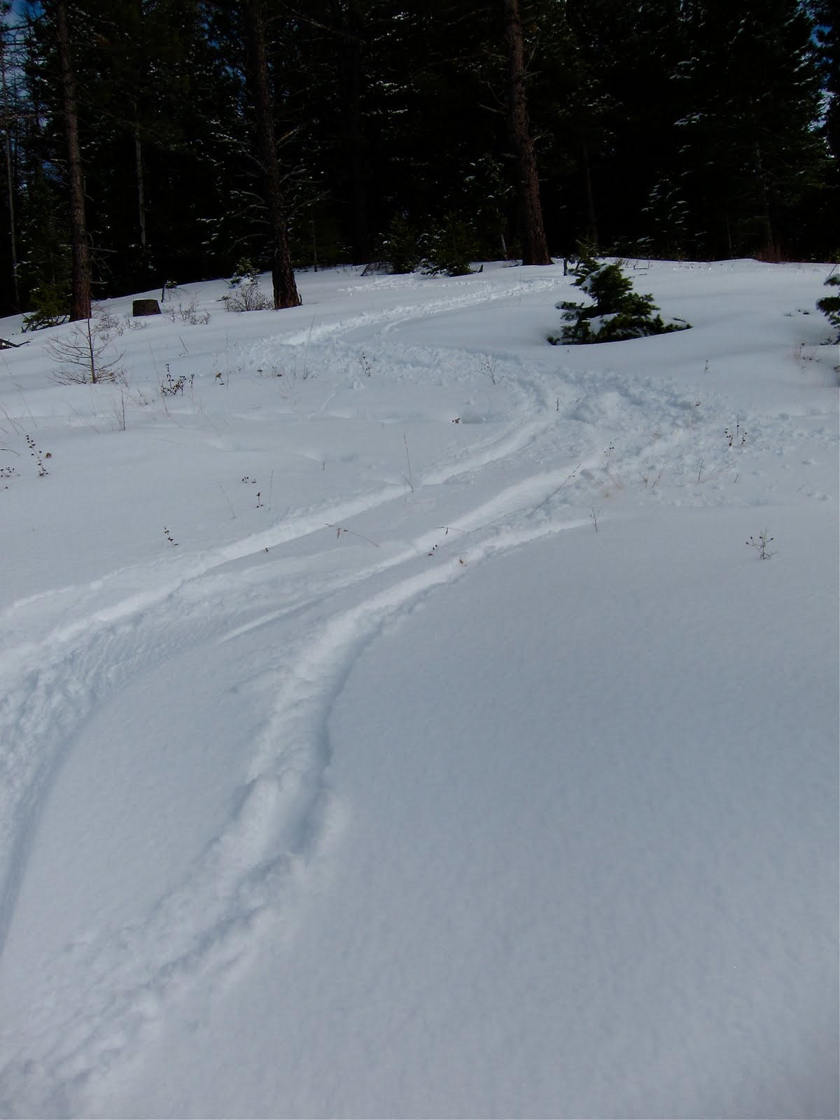 M dropped me off in Pattee Canyon, and I headed up and up, eventually arriving at the saddle between Mitten Mountain and the next knob/mountain to the east. Good skiing was found above the road in an open clearcut. Just enough of a base and 2-8″ of fresh powder on its way into corn. Cowder? Powrn? Quality, sez I.