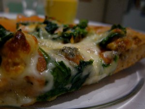 Whole wheat-sesame-bran crust, olive oil, thin sliced tomatoes, spinach, walnuts, lots of stinky blue cheese, and mozz.