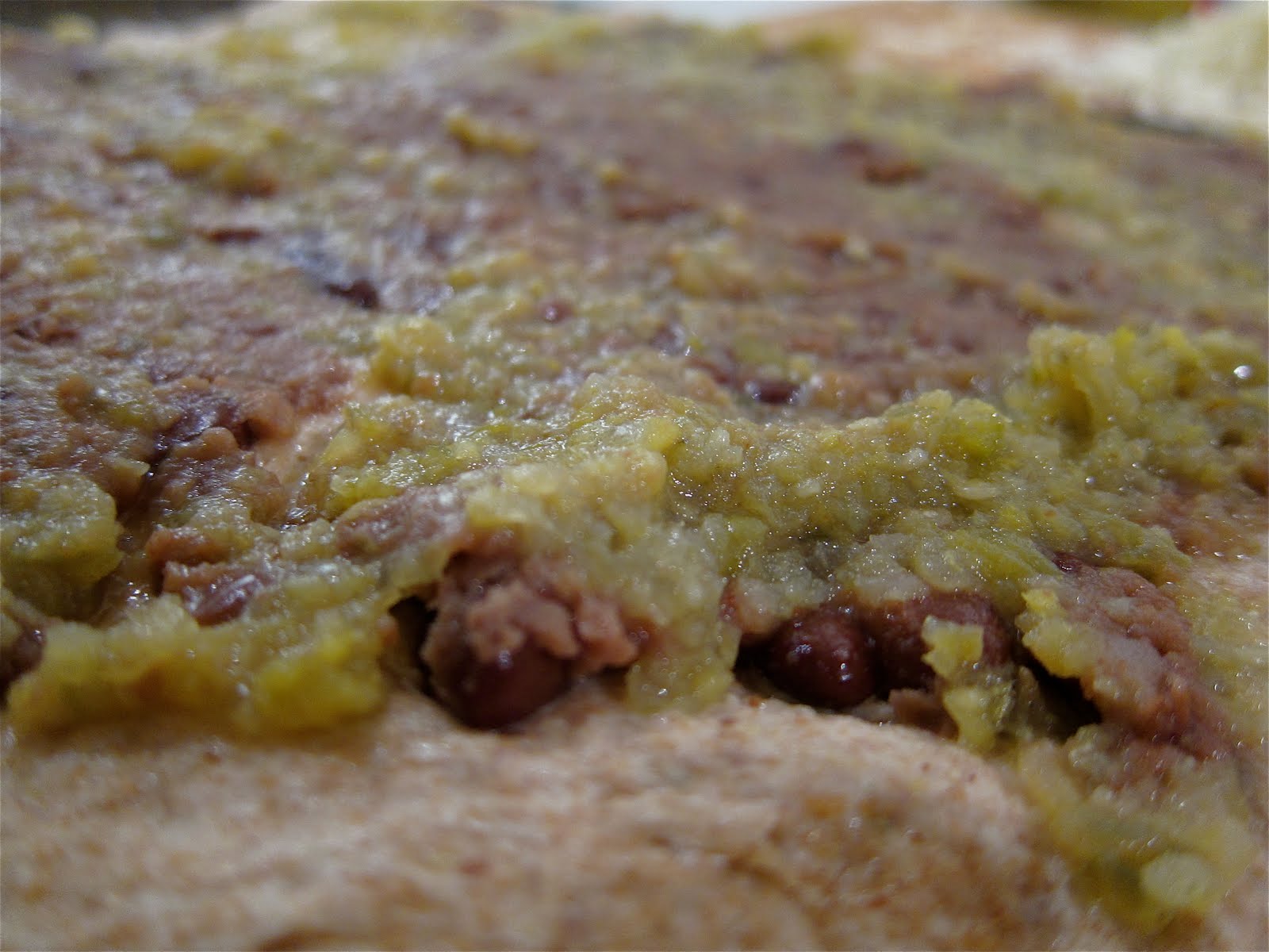 The “sauce” is a mix of refried black beans and salsa verde. Rosarita’s Vegetarian Refried Black Beans are one of the world’s perfect foods, one on which I became irrevocably hooked living in Prescott. They’re fat free, have a bunch of fiber, taste great, and the more of them I eat, the better I feel over the long term. This has very little to do with flatulence.