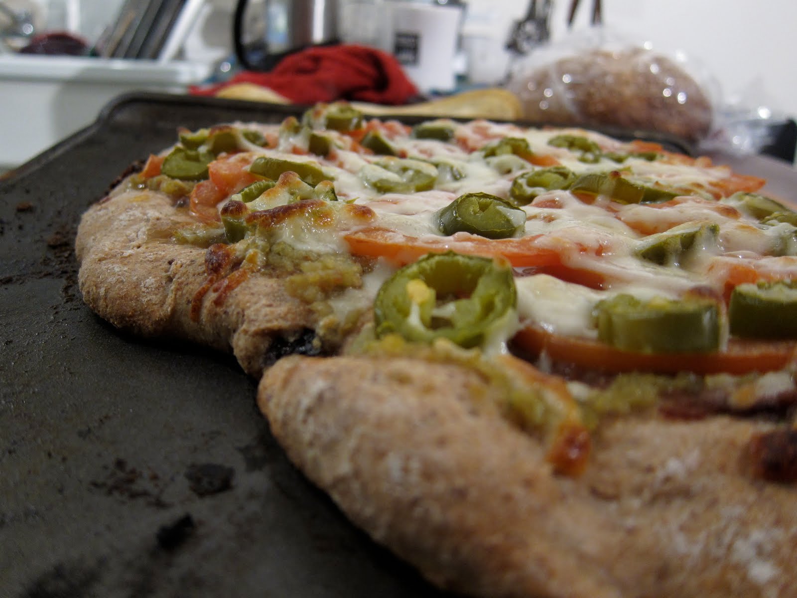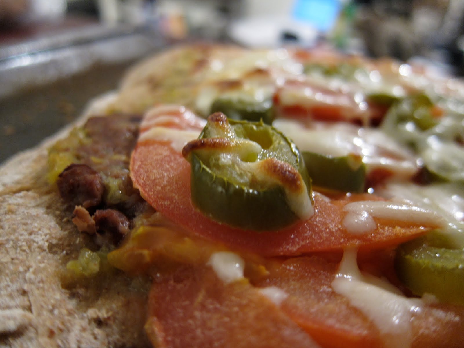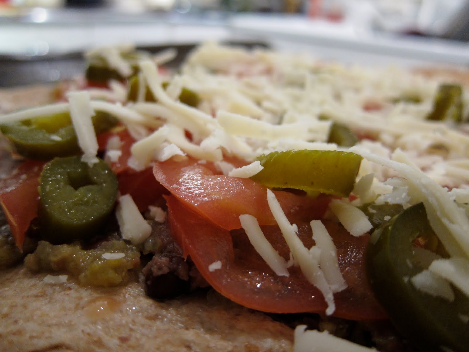 Next, thin sliced fresh tomatoes, sliced pickled jalapenos, and a light covering of shredded mozzarella.
