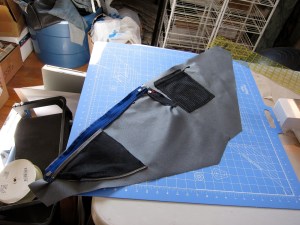 The upper zipper is a double slider, metal #5 YKK that used to be part of some full-zip wind pants. The little vertical zipper came off something else (not sure what, my scrap box is pretty big). Pieces of yoga mat sewn directly to the side panels on the DT and ST provide structure and keep things quiet in the rough.
