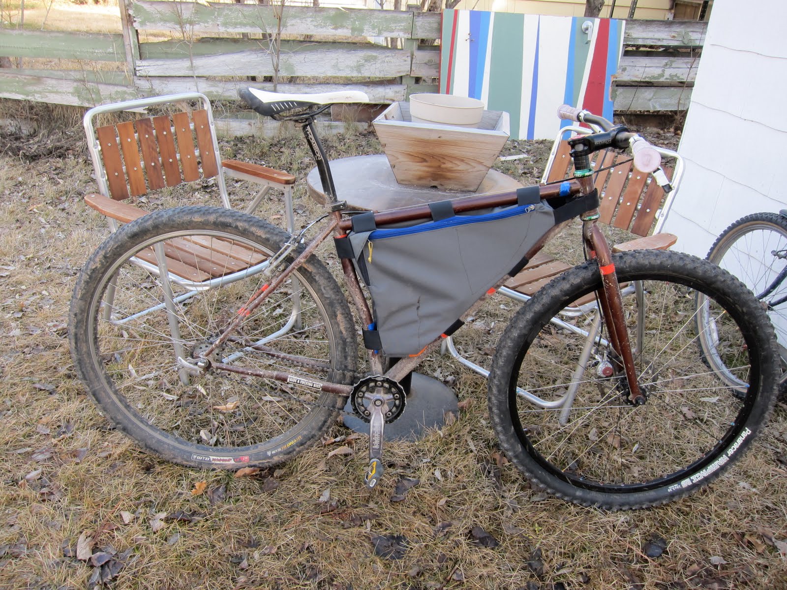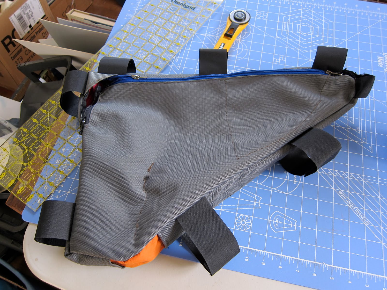 I’ve been planning a new, full-frame bag for the Karate Monkey for over a year. I built it during study breaks over the last few days. By far the best, and fastest, one I’ve made. The big size makes the final seams a lot easier to handle.