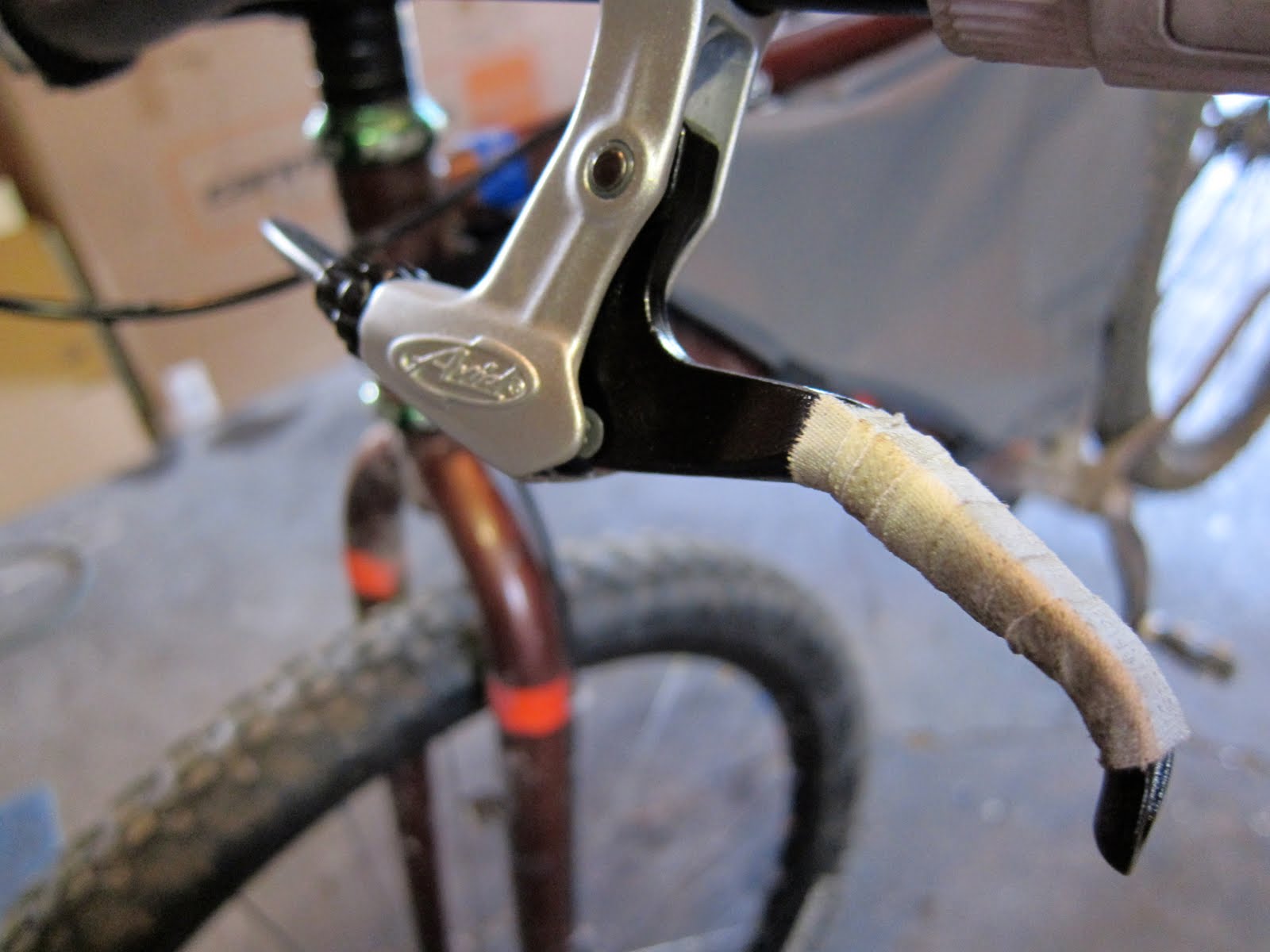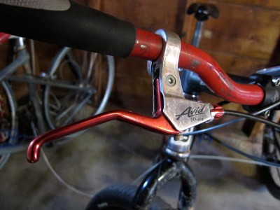I didn’t want to buy new brakes, so I searched out both of the following sets of levers. Both have adjustable cable pull, as they’re from the era when cantilevers fought v-brakes for mountain bike dominance. The red ones I bought on MTBR, the blue ones were given to me by Brendan in a moving show of generosity.