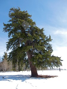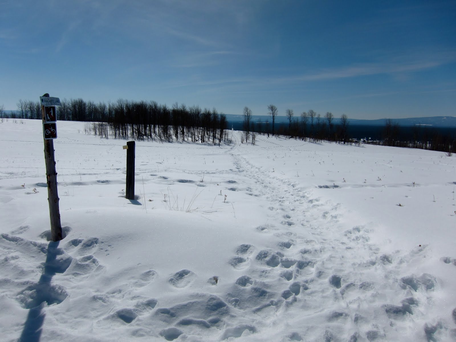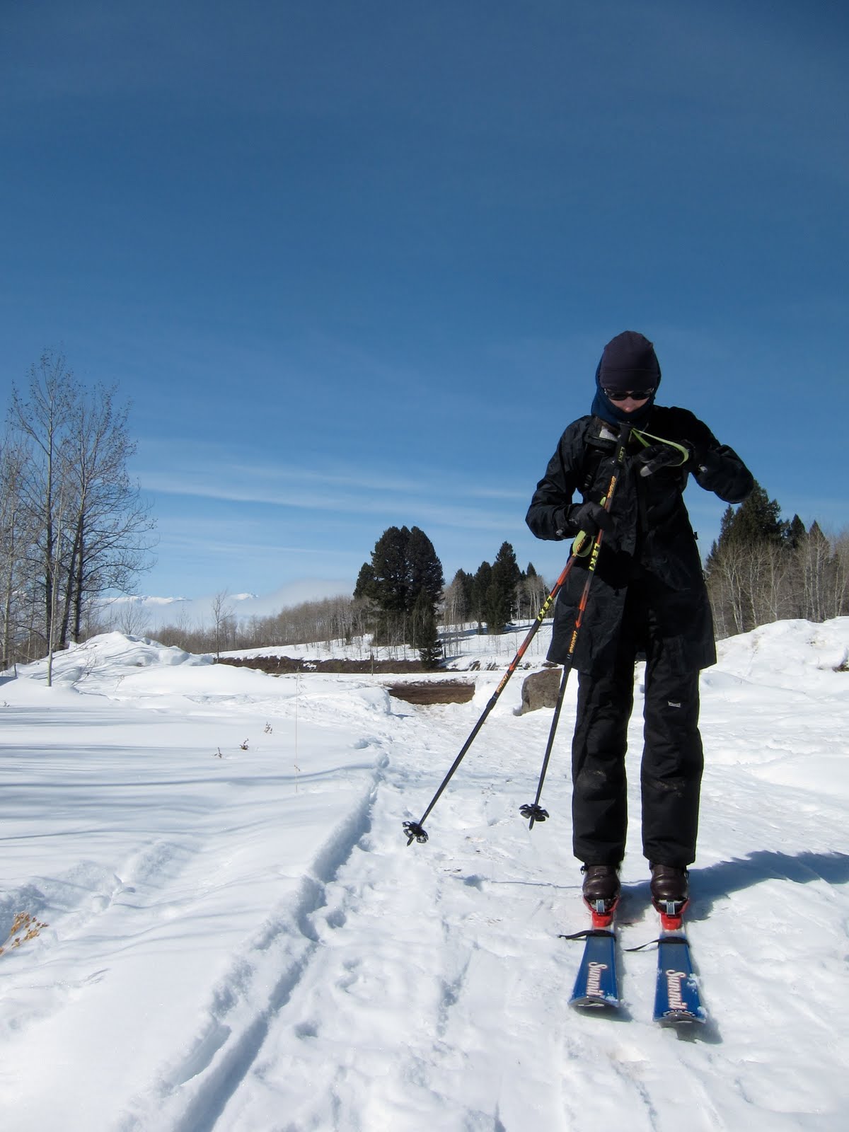 We unknowingly headed towards the Gneiss Creek bear management area, which is closed to human travel from March 10 to July something! Apparently in Yellowstone and in Glacier, the bears are already beginning to stir. Little snow equals early food. So we skied south along the park border, the cut of which can be plainly seen going off to infinity.