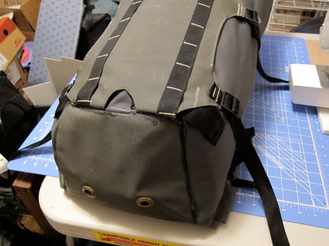 I also narrowed the bottom very slightly in both width and depth, and made the top a bit taller and wider. The mounting point of the bottom compression straps got moved upwards slightly, and I sewed the side seams outside, rather than in. This last was a concession to ease of sewing but more acutely an experiment that will give the frameless pack a bit more natural structure. Around the house tests will 25 lbs of climbing gear feel great.