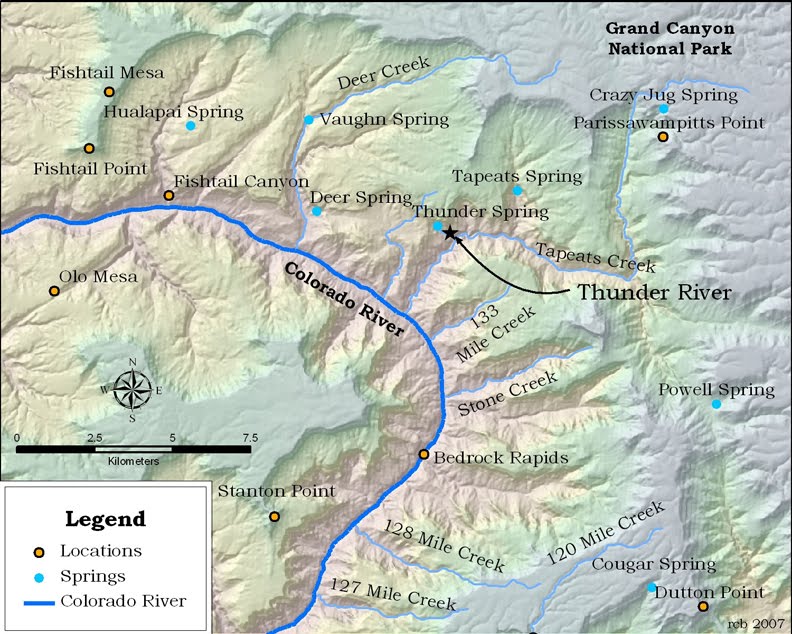 But on to more interesting things (ie the mid-future). This trip would be a technical variation on the classic Grand Canyon Thunder River, Deer Creek, and Kanab Creek loop. See map for orientation.