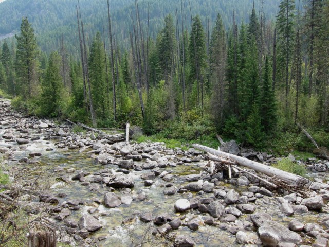 Saturday morning M dropped (from left) Luc Mehl, myself, and Forrest McCarthy off at Hoodoo Lake high in the Selway wilderness. It was chilly at well over 6k. We enjoyed a nice hike on horse trails with stunning views of the Bitterroot crest and Moose Creek valley, which is really big for being cut by a creek. One more demonstration of how arbitrary the appelations creek and river are. We had hoped to float at least some of Moose Creek, but that did not happen. It looked like this about 12 miles above the Selway: