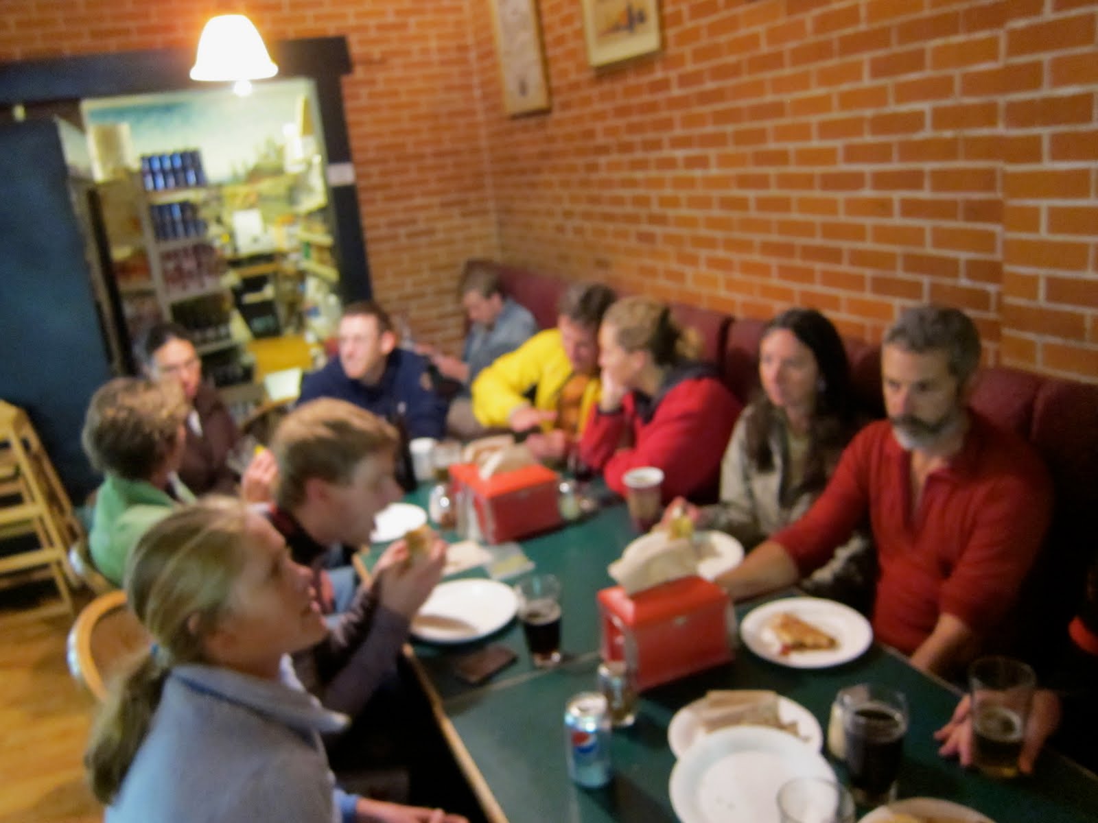 Bridge Pizza is good for the soul. Thin crust, olive oil sauce, sausage, shallots, roasted peppers, cheese, pepper flakes, Cold Smoke. Note Bill prepping for this weekends 8 Hours of Labor by obeying the Chad Brown burrito rule: he who eats the most leading up to the race will win.