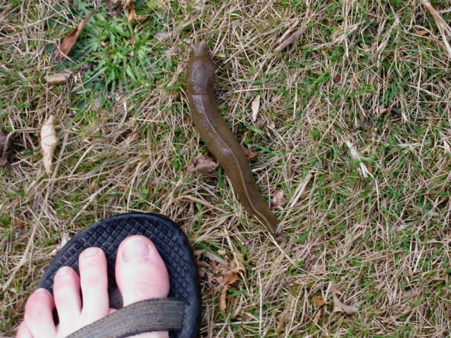 M’s foot and a Banana Slug. M has a long standing and vociferous worm paranoia, based around the perceived unpleasent experience of squishing them. Watching her walk down an Iowa sidewalk the morning after a heavy rain is amusing. She was horrified to discover how fat and prolific Olympic Banana Slugs are.