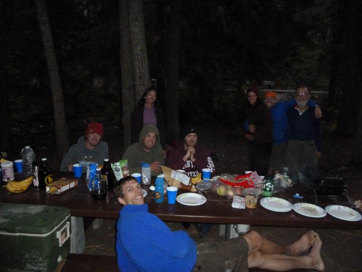 The crew drinking beer and grilling at the Blodgett campground. Note Bill fetal on the dirt in the center background. Larry Dent photo.