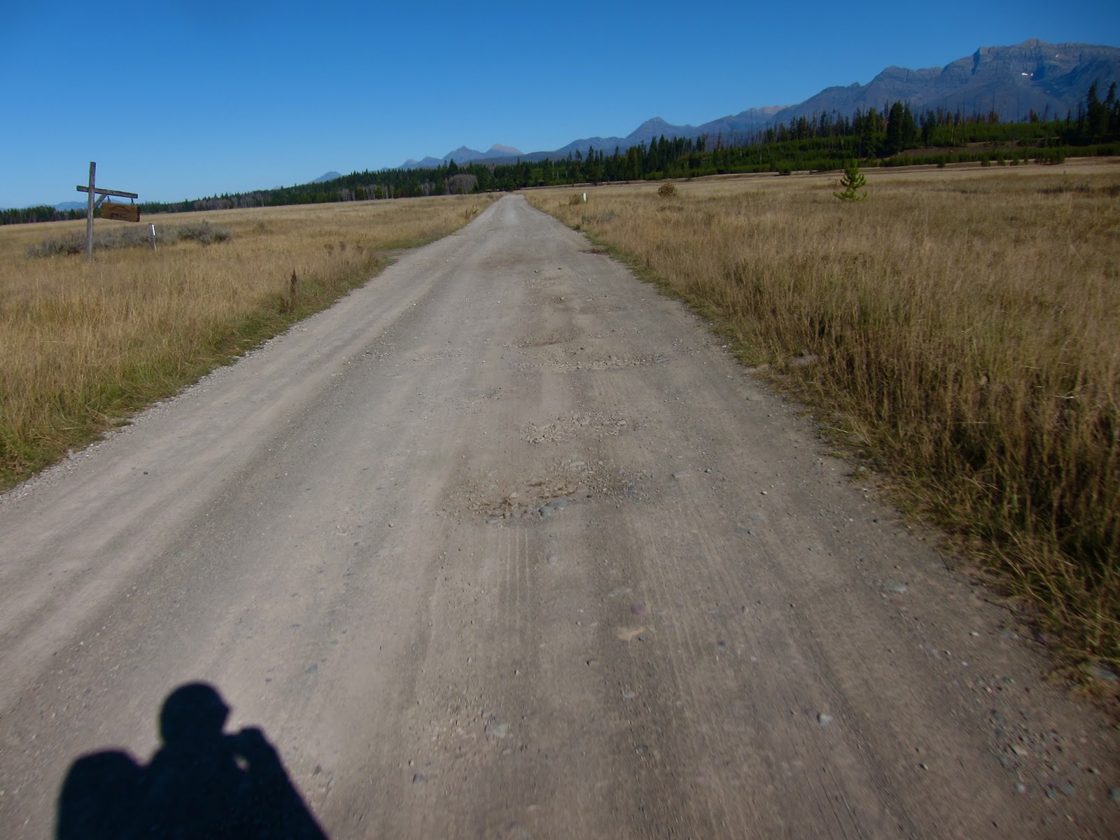 As I was approaching the above hill (riding towards the camera), a brown-tan blur moved through the trees to the left. A bear? A wolf. It trotted away from me, along the road for 20 yards, before jumping back into the trees. I stopped, but could find no tracks in the non-existant dust. Back on the bike, and ~200 feet further another wolf broke from the base of a large pine and ran across the road. I stopped pedaling and slowed to a stop, just as two more wolves, these stereotype-gray, trotted into the road, stopped, and in unison stared at me for a few seconds before vanishing into the grass. All from 50 feet away.