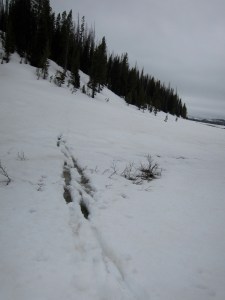 What haunted me was the thought of ski-necessitating snow down in the Yellowstone River valley, on the Thorofare trail. I had been mostly hiking on the Buffalo Fork trail the day before. Though treed sections had plenty of postholing, the south facing sections had been snow-free, even at 8000 feet. It was only in the upper reaches, when it curved to the east, that the skis had come out. Around noon I was crossing the Two Ocean, and my energy began to flag. I pulled over under a old Whitebark Pine, to eat my breakfast cereal and brew coffee on my esbit stove. I relaxed under the shelter of the tangled tree, as it had begun to rain here at over 8000 feet, and pulled out the maps. The Thorofare was mostly as low or lower than the snow-free reaches of the Buffalo Fork, and the trail looked to be primarily out of the trees and of a favorable, south facing aspect. Sitting out of the rain, with a full belly and sipping hot coffee, I could allow myself a reasonable amount of comfort. My slow trudge would not last forever, and this really was a pretty cool spot. I was better off than the postholing moose and grizzly I had followed over the pass from the Buffalo Fork. In numerous places the moose had sunk its leg five feet deep, leaving belly troughs as it wallowed along. Besides, the moose had no coffee, hot or cold. I packed up and continued, cheerfully resigned to my fate, however miserable it might be.