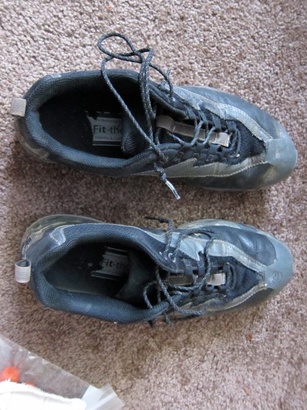 I made three modifications to the shoes before wearing them outside. I cut the silly lower lace guard off with scissors (dead easy), as it interfered with using gaiters. I glued a 2″ square patch of velcro to the back of the heel for Dirty Girl adhesion, which I do to all my hiking shoes. I also treated the leather with two thick coatings of beeswax, warming the leather before and after each coat by placing them on the open oven door (with the oven on 200 or so). I was concerned that the many, many wet-dry cycles to which my shoes are subjected would cause the leather to dry and crack.