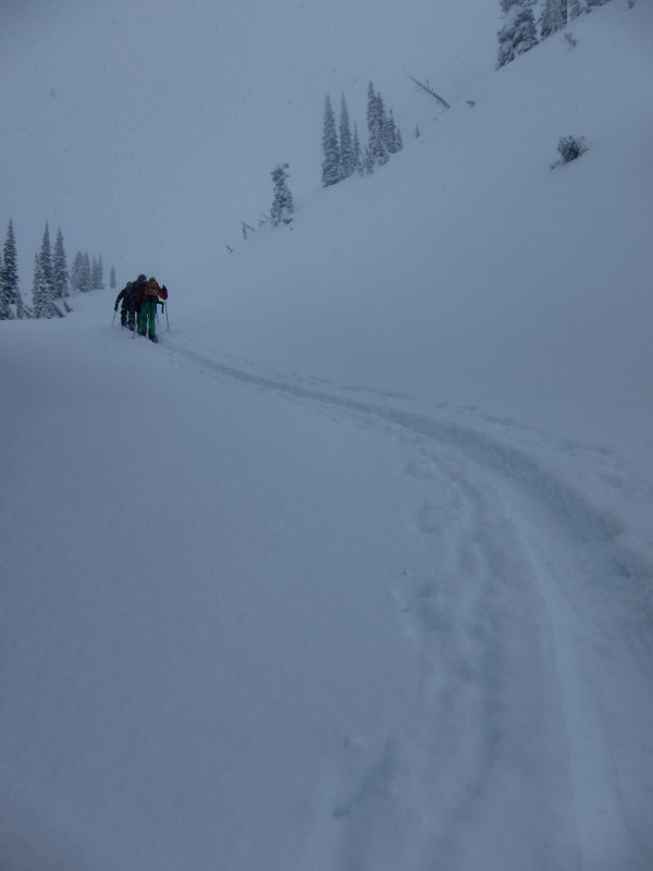 Let us address each point briefly, beginning with the first. Hiding up in those white’d out little trees was 2-3 feet of the purest cold smoke. More in spots. The pitch in the far looker’s-left of the picture, which we skied, is between 35 and 40 degrees. First time getting the Marquette BCs charging in that much super-light snow, and on terrain that steep.