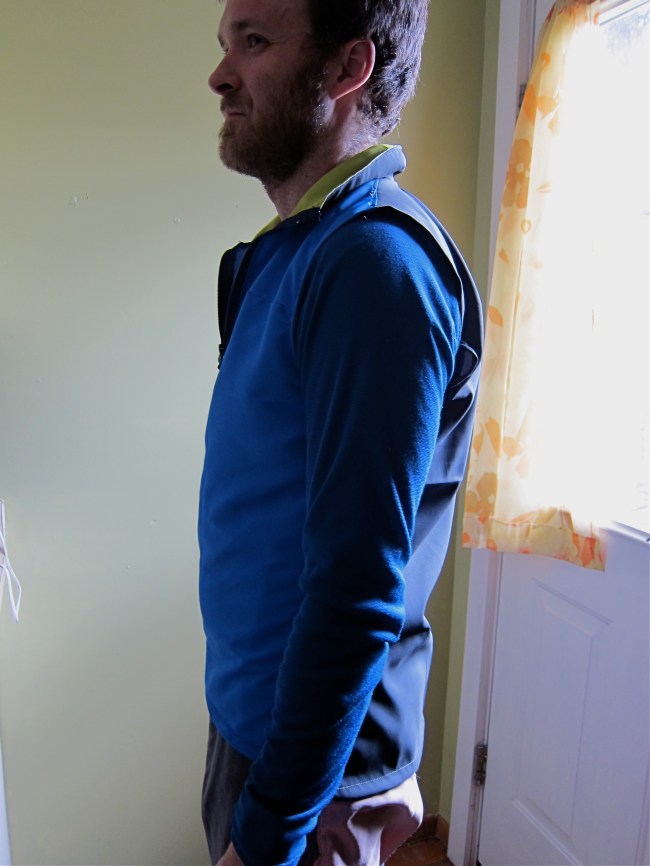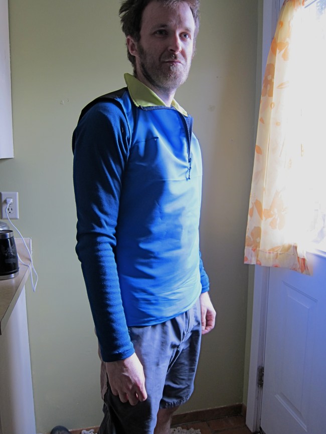 It is entirely made from Pertex Equilibrium, as I have plenty left over from my anorak (which has been rendered mostly useless by my Essenshell). It is very remarkable fabric, which ought to lend itself well to a layer designed to provide some extra wind and precip protection with minimal impingement on breathability.