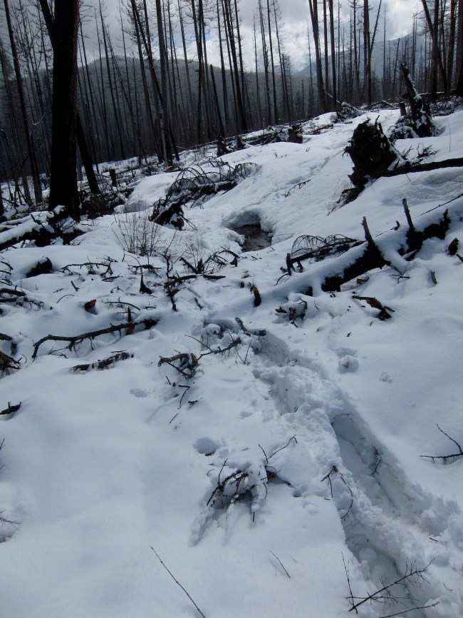 The trail goes that way, though I bailed on my goal of going all the way to the lower Nyack camp and headed off to find the creek at this point. A choice which led to even more “fun.”