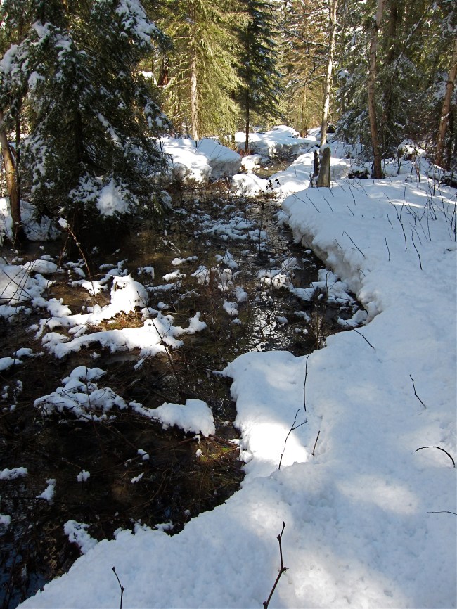 This is not Nyack Creek. I thought it might lead to it, but the steady current sieved-out into willow thickets and under snowbanks. Snowshoes back on, boat back away, more postholing and occasional breaking into flowing water of unknown depth under 2-3′ of snow. Conditions which, quite frankly, suck, but I had never experienced an only partly thawed seasonal swamp before, so the route redeemed itself with educational value.