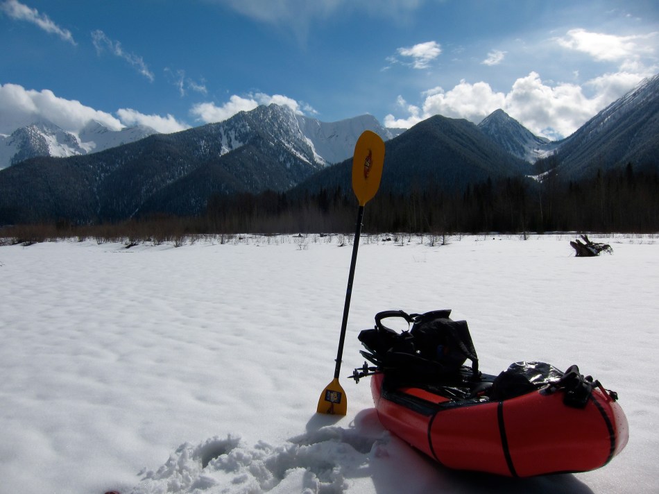 Lower Nyack is a classic packraft float. Except for (because of?) some really, really big wood jams. Downstream goes off to the right of the above photo. I got some good practice in ferrying onto micro-beaches, pushing the raft ahead as I postholed along, and seal launching off snowbanks. Other than that it was nice, fast class 1 with plenty of logs in, on and mostly underneath the water to keep me on my toes. The wood relented (for the most part) before a series of twisting oxbows, and relented entirely not far above the old bridge site where I put in on the way out last weekend.