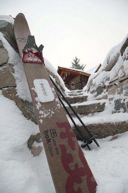 The Altai skis Hok, available this fall. Comes in 125cm and 145 cm lengths, looks to have a nice early rise tip, minimal sidecut, and a waist around 120cm. Metal edges, and an inset skin underfoot.