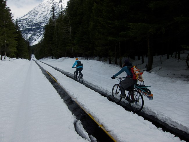 We finally got our weather today, and headed into the park: blue sky, clouds, mid 50s, mountain bikes, snowshoes. Mom, being shortest, rode M’s bike. M rode my singlespeed because it has a slightly shorter cockpit, and I rode the Lenz. M’s bike had the rack installed, and she choose the pack that carries snowshoes, so she was the gear hauler for the day.