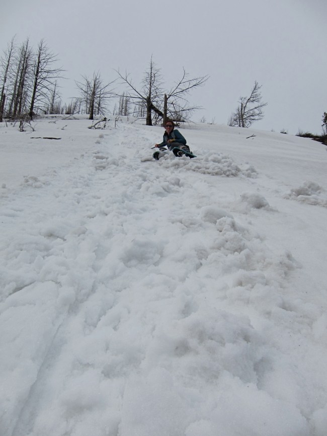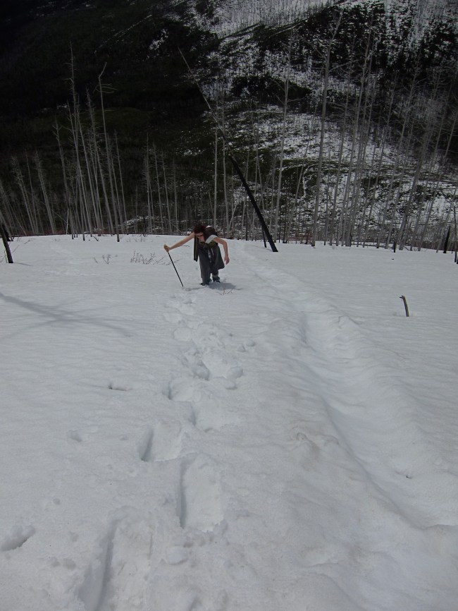 At around 4500′ the trail disappeared, and we just went straight uphill. The most treacherous part was the heat sinks created by all the buried deadfall; snow melts around the log and creates nice waist deep surprise holes. Be careful not to sprain an ankle.