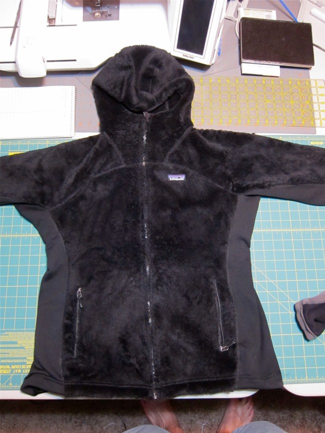 This is a women’s R3 Hi-Loft hoody, size XL. I got it half off from Patagonia’s website. As keen observers are no doubt aware, Patagonia makes many great garments with great hoods, but often only for women. The answer I’ve discovered for this dilemma is to buy an XL, which seems to have a sleeve length between a men’s M and L, and take in the torso to fit. As you can see in the above photo, the torso it pretty room, and as you can see from aforelinkedto catalogue shot, the hoody is cut to show off sexy hips the I simply do not have.