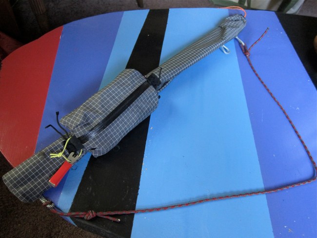 Construction and design are impeccable. The pocket is gusseted in just the right way, the top panel is wider than the bottom, thus making it easy to get things out as well as stuff it full. The two top loops allow shorter and taller folks to set the shoulder sling at a good length. I replaced the stock shoulder cord, with it’s cordlock adjusters, with a fixed length of slightly thicker cord, which tangles less in my backpacking pack. I also replaced the dual-clip plastic buckles which attach the pouch to the quiver with loops of cord, which are lighter, more low-profile and little tighter.