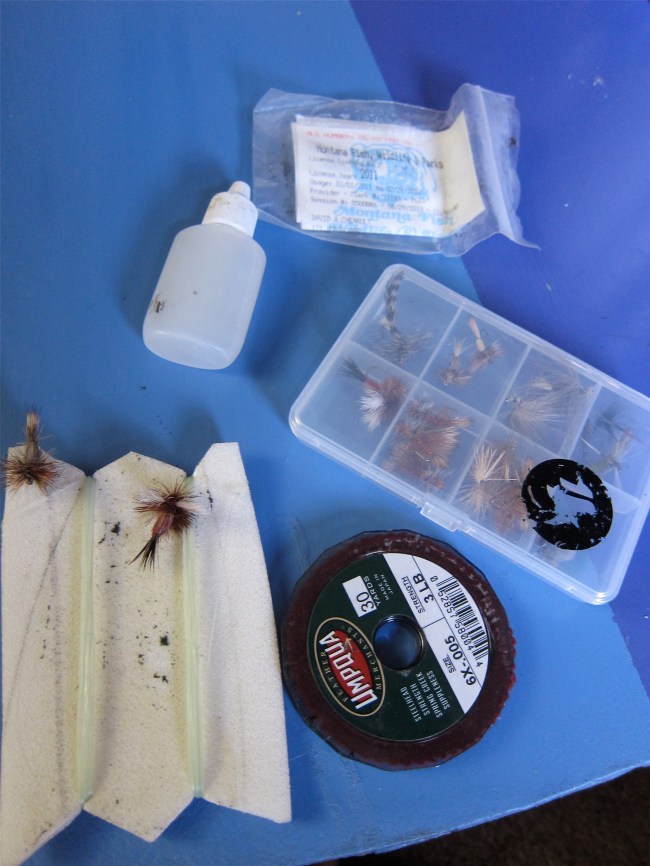 All the stuff I bring for a day of fishing, which fills the Ebira pouch to capacity: TenkaraUSA fly box, license, floatatant, spool of 6X tippet, and bit of foam board with two level line/tippet/fly combos pre-tied and ready to go. You don’t need more, but there’s no room for indulgence.