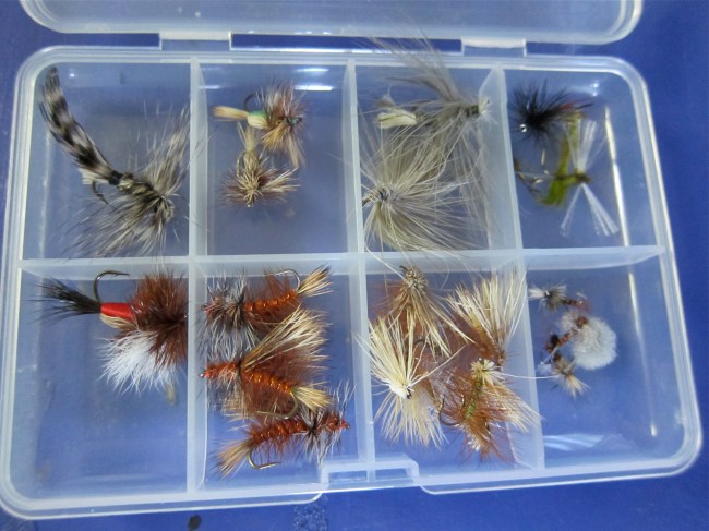 My fly box at the moment. It’s the one TenkaraUSA was giving away free with orders earlier this summer, and I really like the larger, thinner compartments. I’d do a details analysis of what I carry and why, but I don’t know the names of most of these flies (and some I tied myself). The general theme, as showcased in the leftmost six compartments, are larger, generously-hackled dry flies. There have lots of float and visibility for high-gradient streams. Top right are some nymphs and odd things, which hardly ever get used, and bottom right are the tiny flies. These come in handy upon occasion when the tiny trout are biting, fish small enough that my larger flies have hooks to big to be easily swallowed.