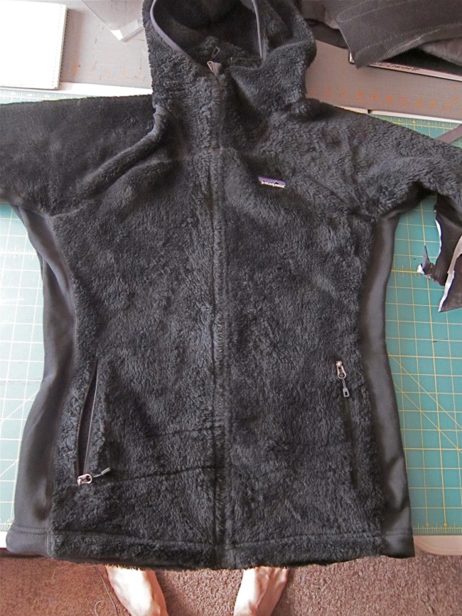 Fortunately this mod is easy: measure the torso and waist diameters of a few of your favorite garments that fit, and figure out how much you’ll need to take it, next remove the stitching from the hem, so you can sew through it, then invert the garment and sew a simple stitch down the middle of the side, taking out as much as you need. You can do this in stages, trying on the garment to check fit and fine tune. On this project I sewed up to just above the armpit. Once you have the fit correct, run a second line of stitching over the first (use thinner thread and a tight, short stitch) then cut the excess fabric off. Singe the fleece so it won’t fuzz out, resew the hem and you’re done. The dedicated could add a binding to the new seam, but this is for aesthetics only and I’ve never bothered.