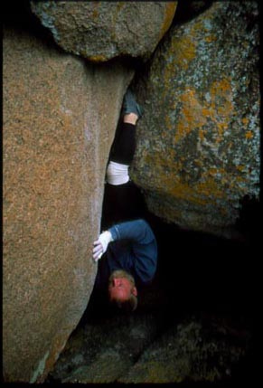 Scarpelli on Life Without Parole during our trip in 2000. Photo by Kris Hampton. Utterly flumouxed on that occasion, I had to come back on another trip to finish it off. Yes you have to get back upright in the course of topping out.
