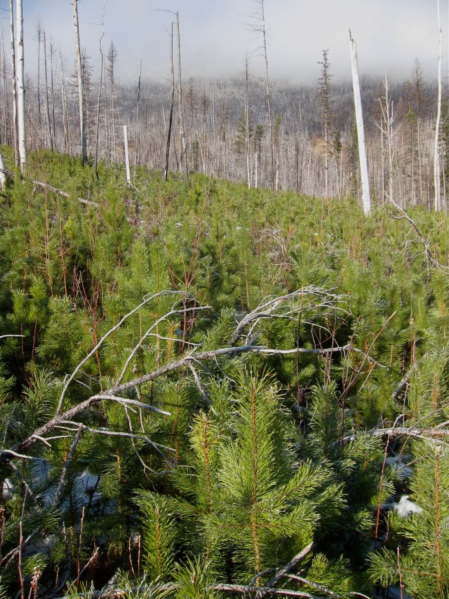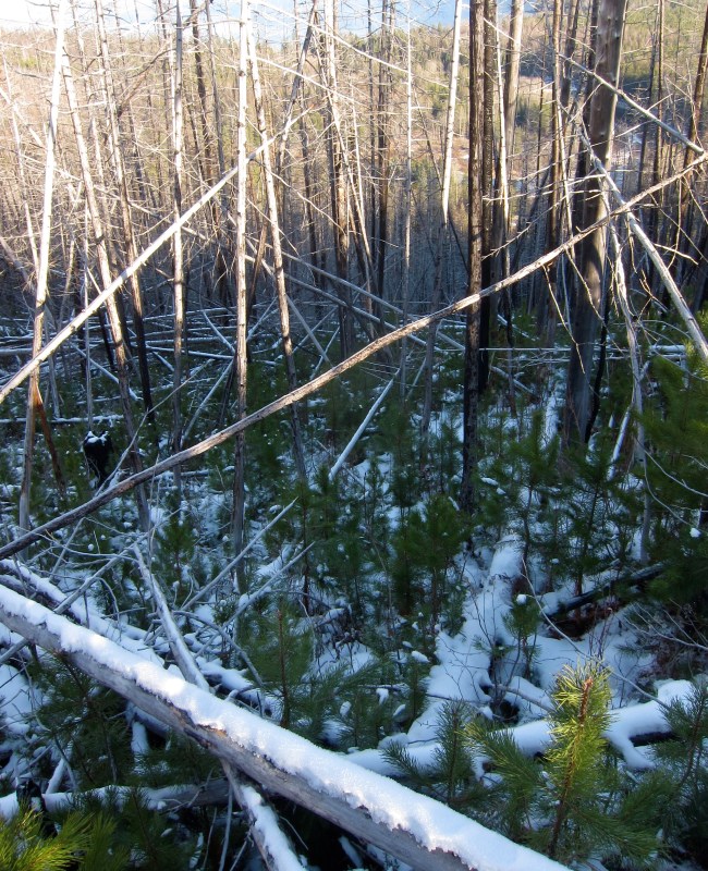 The road across the circle bridge up to the lookout trailhead is closed, so rather than walk those few miles I took a hard right immediately on the far side of McDonald Creek, cut up through the old burn, walked a bit of the old two-track which follows the water pipe (a spring on the hillside supplies Apgar Village and park headquarters), then bushwacked uphill to meet the first switchback on the trail, which I was pleased to hit dead on.