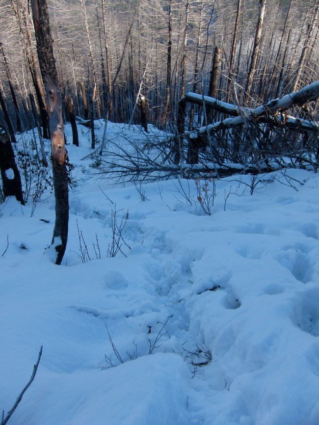 The descent went as expected: very slowly. At first there was 2 feet of snow in which to posthole, and when that thinned out a bit I found some deer trails to follow.