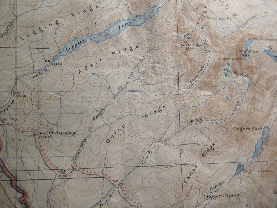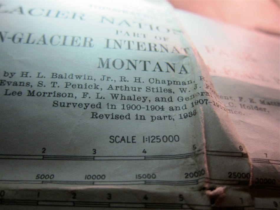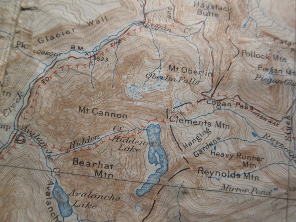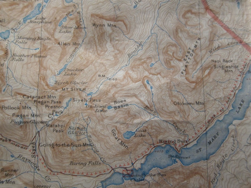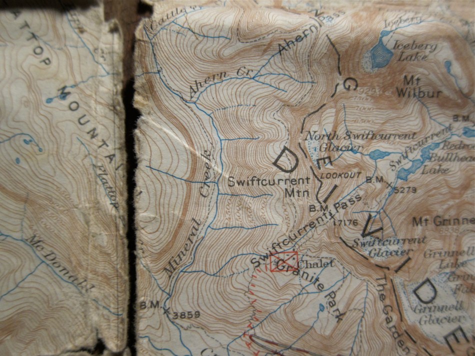 A very old map of Glacier, still just barely in one piece. We were enthralled at all the changes which have since happened. I’ll highlight a few things, but the photos which follow are best appreciated with a knowledge of the park and/or a modern topo at hand.