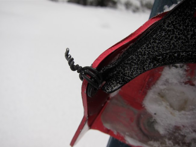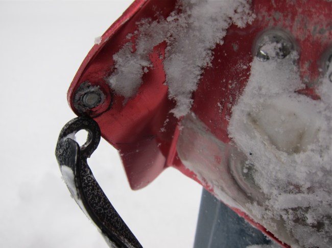 And an hour before I had been dwelling on how superior 3 pins were to NNN. Then I took an odd, lurching, sideways, almost-fall navigating deadfall and twisted my boot out of my binding, the force which I believe did in the rivet holding the toe bail on.