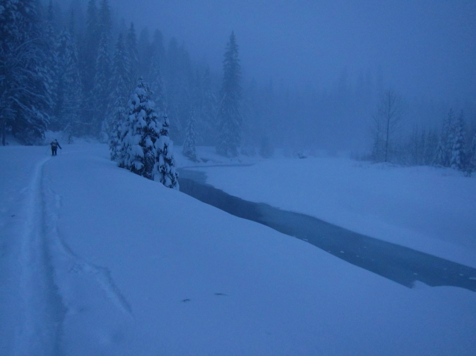 We got our coordinates, found the site (we had skied within ten feet of it earlier), and broke trail, back the way we came and downhill, into the rising blue gloom (lead photo). It had been a noble failure, even if we could have stacked the deck a bit better by taking the conditions more seriously, and the closing night and rising storm felt like the worlds embrace, rather than a threat.