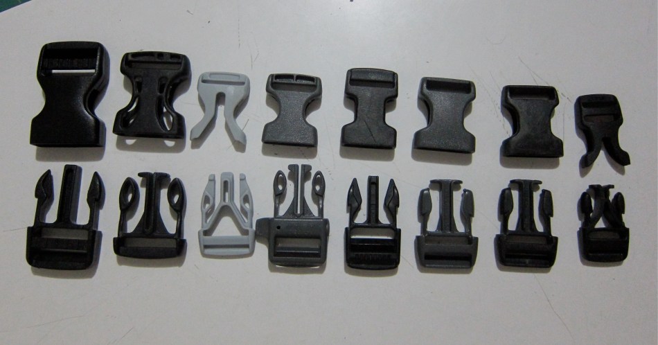 It used to be that if you broke the male end of a fastex buckle, a not entirely uncommon occurrence, the only metric you needed to worry about when finding a replacement was size. All buckles, be they 1″ or 3/4″, looked like the leftmost pictured below. One buckle, or part of a buckle, reliably worked with another.
