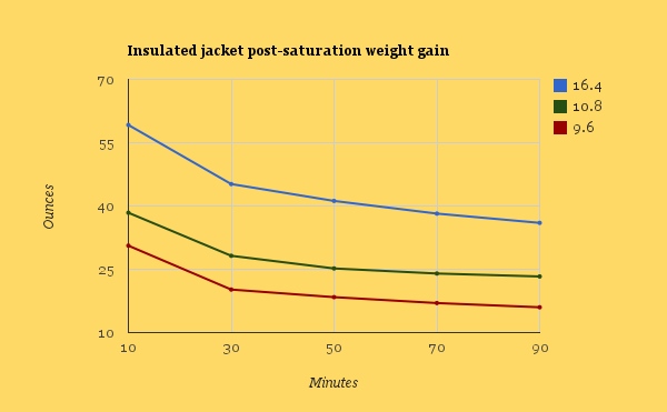I’m beginning what will be a very extensive BackpackingLight investigation into this question, and some bathtub saturation testing recently produced some noteworthy results. Both graphs are drawn from the same data, and show three garments with comparable insulative values and feature sets. The key numbers in the below graph are the dry weights of each.