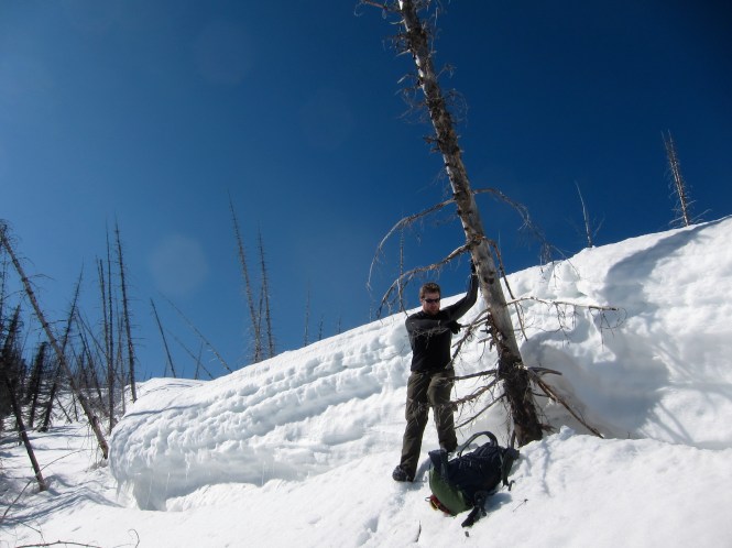 Because that stretch took us two hours. Most of the Apgar Range burnt well in 2003, and the detritus is still to be feared. The first part still had a decent bit of snow, and thus the main hazard was merely dodging trap doors in the snow laid by deadfall (which acts as a heat sink and melts out beneath the surface).