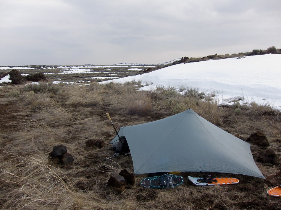 Conversely, the Shangrila gets the nod for snow shedding, due to the long and steep ridgeline created by having two poles. The Trailstar can be pitched with a tall, narrow door that will greatly enhance its resistance to collapse (in contrast with the wind shedding pitch shown above), but the Shangrila is still substantially better here.