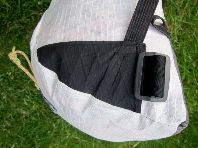 Shoulder straps are from the OMM Adventure Light 20, a bit wider than I usually prefer, and set a hair closer together. Reason being I hope to avoid the need for a sternum strap. Huge handle for hauling while climbing. Grey VX-21 panel contains a 3/8 inch foam pad, much softer closed cell than the back pad, to prevent tailbone chafe.