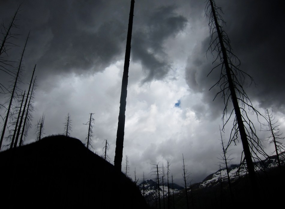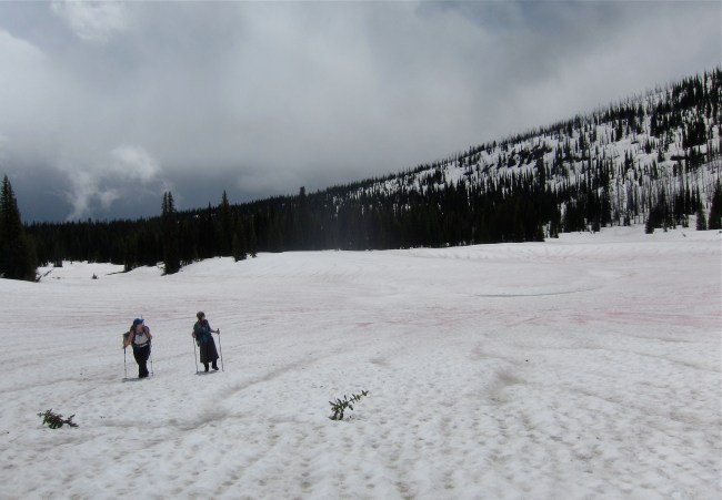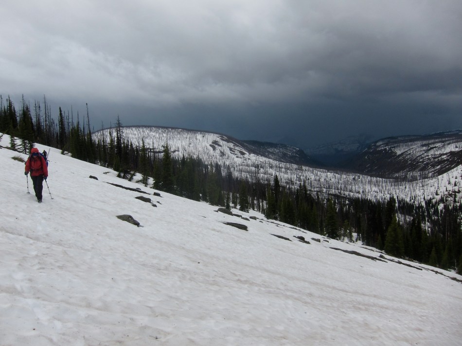 When the rain did come it came hard fast and sharp, and we got soaked. I wasn’t too worried due to the brilliance of our plan, and the only reason Megan had let herself be talked into the trip in the first place: we carried neither camping gear nor dinner food, and were bunking and dining at the Sally Chalet that evening. We did go a bit high on the traverse over towards the Kootenai patrol cabin, adding a bunch of pointless distance when we got stuck above cliffs rather than below them. I lost patience with myself, but the clouds parted a bit for the traverse down into the Waterton Valley, we checked out a bear den (empty) right off the trail, and had a few snow fields to cross with our axes, all of which kept my mind occupied. The snowshoes we carried all trip were never needed, so solid was the snow.