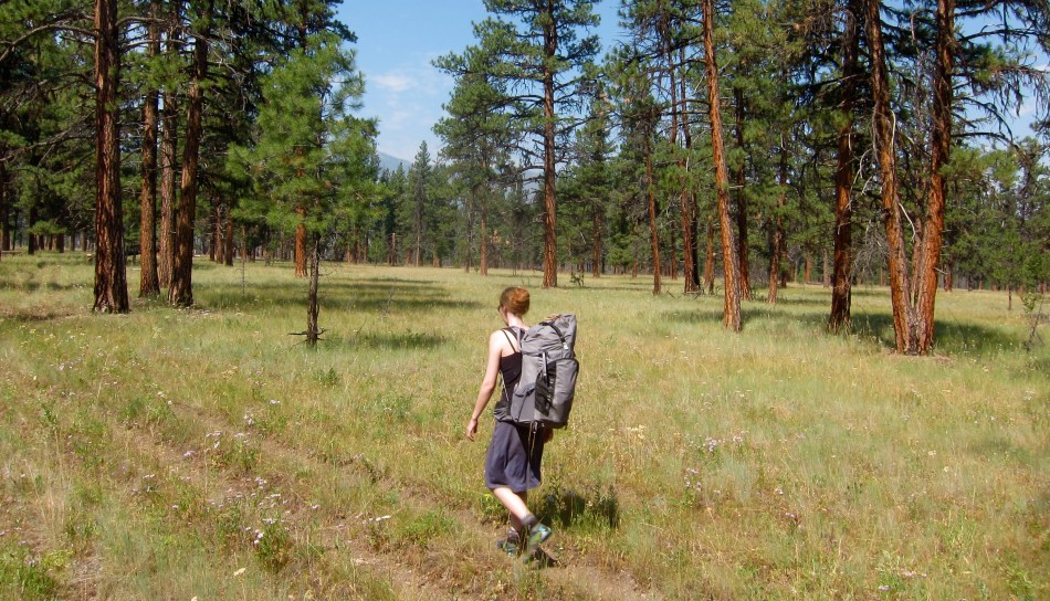 Late on the first day this year, as we strained into the distance looking for evidence of the Big Salmon drainage and wondering whether hiking so far up would be worth it, I realized we could leave our camping gear and most food in situ, and walk to Big Prairie with day loads. M and I had switched pack in the first mile, as the Jam didn’t provide enough lumbar anchoring to allow her to weight the hipbelt as she prefers. My black and white pack did that fine, but the stiff lumbar padding, designed for me, rubbed her lower vertebrae raw. Miles before she had stuffed socks between the belt and her back to provide buffer space along her spine. Walking with light loads the next day was welcome, through nice fishing on the White River and the tremendous larch and ponderosa fields south of it, though the late morning heat did wear on our resolve to make the stock bridge. We finally made the water, floated back to camp, built a fire, roasted a fish, and slept.