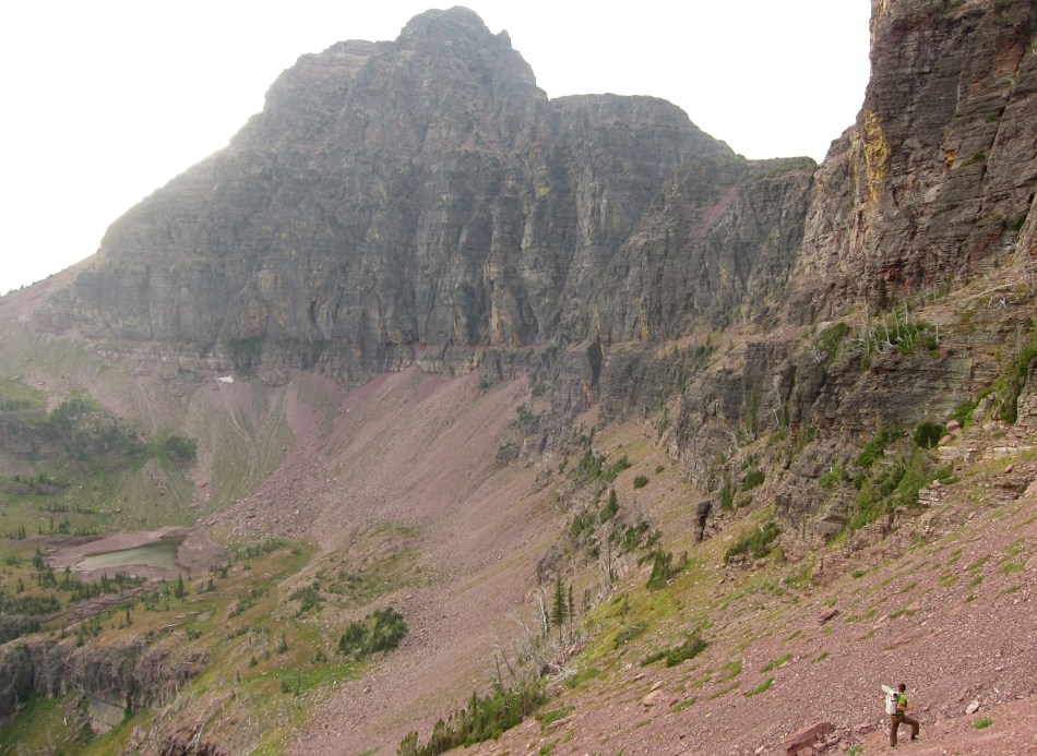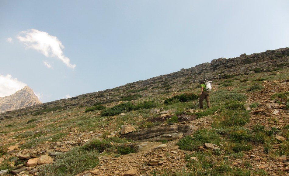 By the time we were close to below Dawson itself, the cliffs had relented such that everything was just hard class 2, “if the proper route is taken.” The terrain actually pushed us a bit north of the lowest point, on typical Glacier munge: 20% ledge, 10% dirt, 40% scree, 30% talus.
