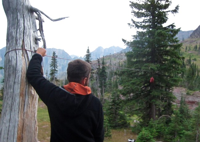 The ranger at Two Med said they do not give undesignated (off-trail) permits for Aurice. Too close and easy. Normally they’ll insist that any undesignated permit also carry a bear can. We convinced them we could hang our food, and found this excellent tree. Even big trees like this have short branches, so I use the Sawchuk technique of clipping the bag to the line with a micro-biner, and using that to pull the whole rig away from the tree, thus creating adequate space from climbing juvenile bears (or expeditious pine martens). Odorproof food bags and hanging away from where you cook are of course good ideas, too.