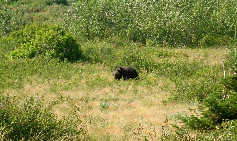 This fellow, perhaps the prettiest grizz I’ve seen and certainly the darkest, was feasting on Serviceberries as he ambled and noticed us not at all. About the best example of shoulder hump and dished face I can recall.