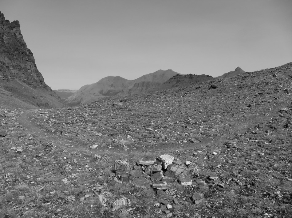 The hard dirt makes the tread less obvious, but a boggy section rounding the corner makes it reappear. A brief scree descent leads to what would be an outstanding destination in its own right.