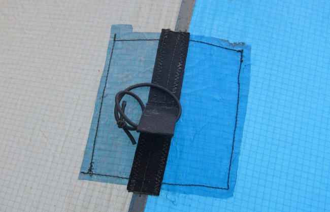 Obviously I value strength over precision and neatness. I made the patches out of the factory stuff sack, and as I didn’t have a pair of scissors in the garage and didn’t want to go upstairs to use the rotary cutter, made do with a box knife.