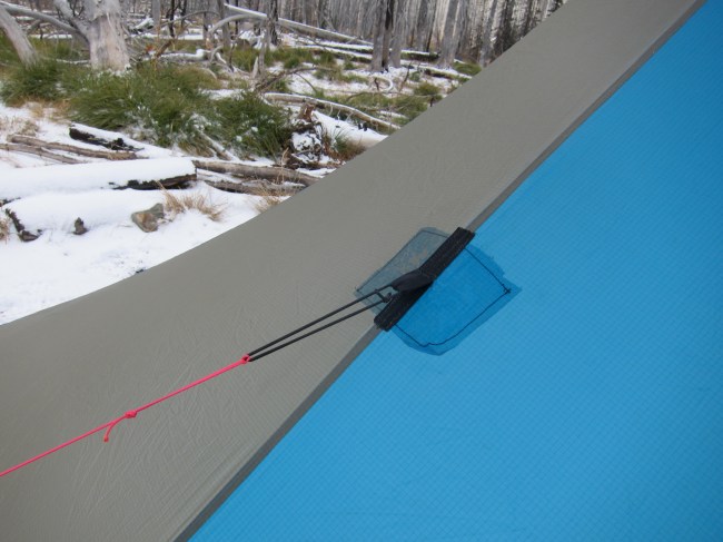 Mid panel tie-outs attached to guy lines with a loop of shock cord, which damps the loading during gusts.