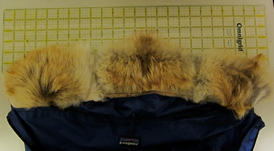 On a few occasions last winter, usually skiing into a nasty headwind, I remembered that fur ruff and thought that it would be a good idea. So early this week I ordered a coyote pelt from up the road. It arrived yesterday, and I took a bit of time to add a ruff to my Patagonia Essenshell anorak.